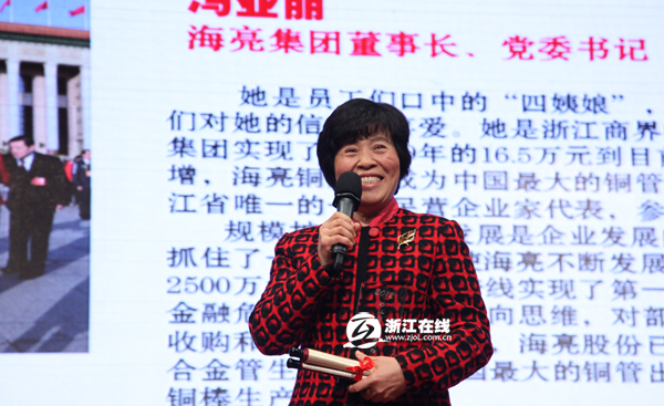 她是員工們口中的“四姨娘”,親切的稱呼透露出員工們對她的信任和喜愛。她是浙江商界的“奇女子”,帶領海亮集團實現了從1989年的16.5萬元到目前的344.51億元的資產遞增。2012年,她作為浙江省唯一的一位民營企業家代表,參加了黨的十八大。